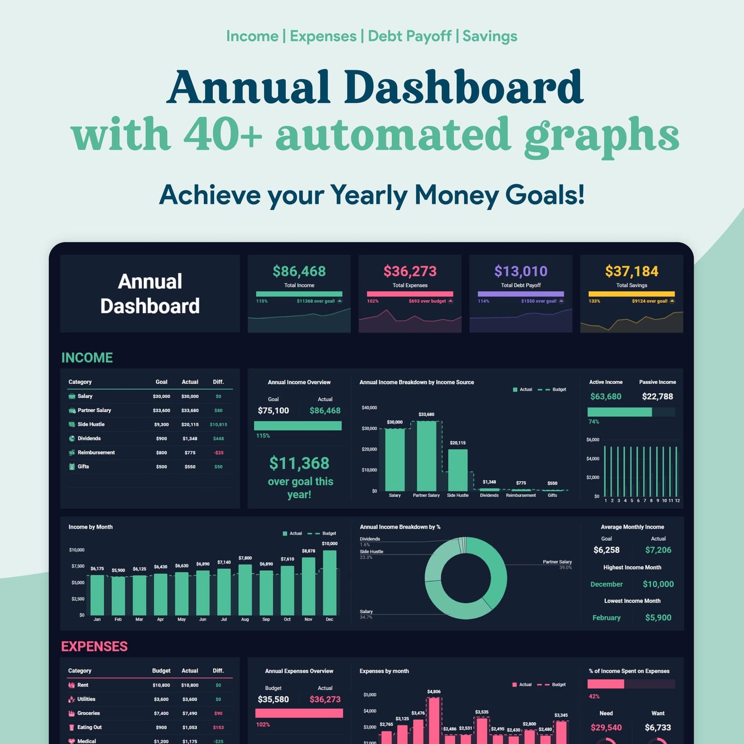 ✓ Monthly Budget Dashboard – 12 individual monthly tabs for easy budgeting.